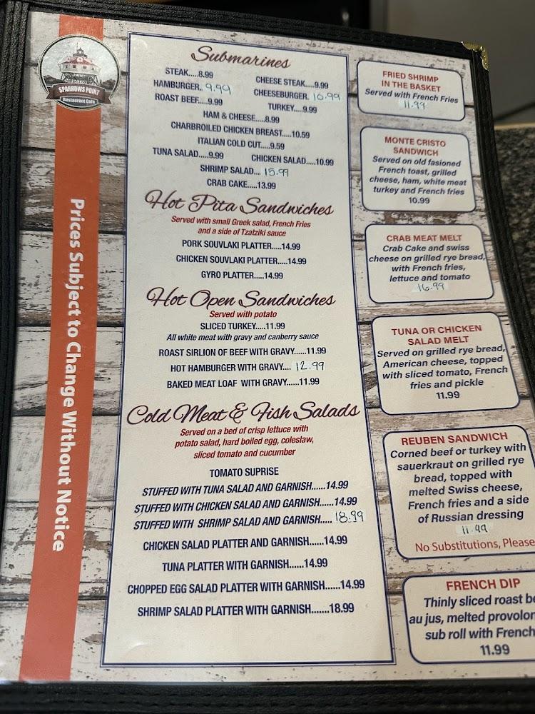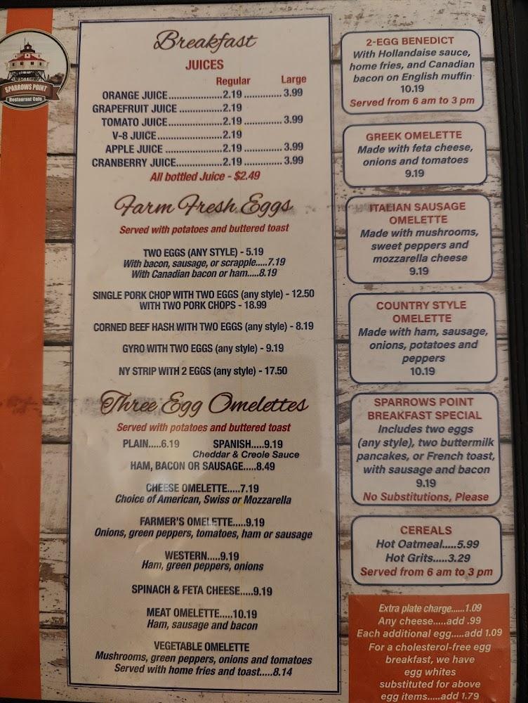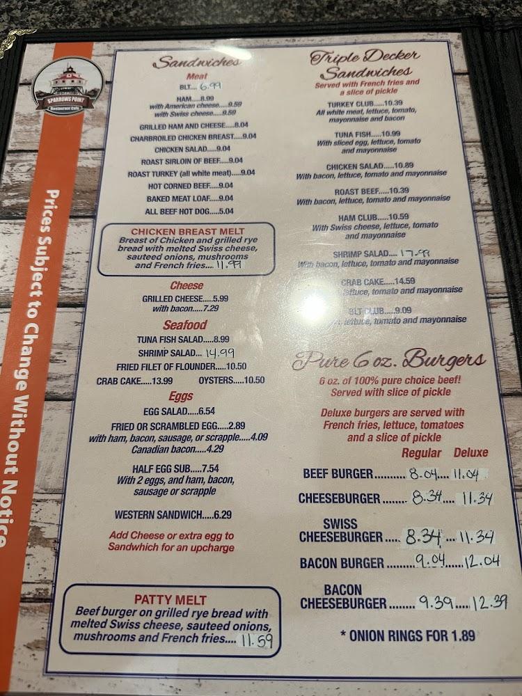 Sparrows Point offers a comprehensive menu filled with local and traditional American offerings. From hearty breakfast items like golden pancakes to lunch favorites like charbroiled chicken breast. Every dish represents comfort food perfected. Options range from seafood specialties to casual burger fare.
